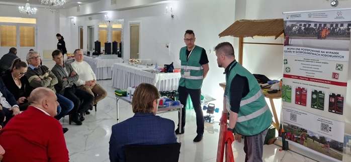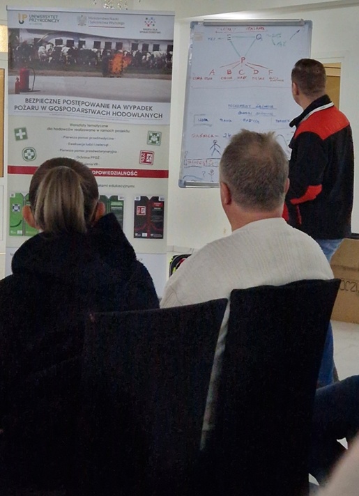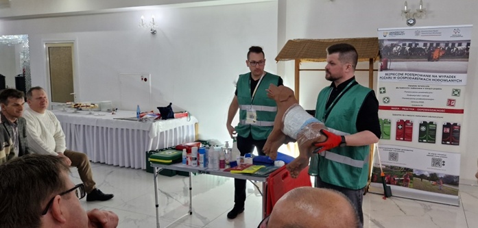 W ramach realizowanego projektu „Bezpieczne postępowanie na wypadek pożaru w gospodarstwach hodowlanych” przeprowadzono kolejne szkolenie połączone z warsztatami z zakresu ochrony przeciwpożarowej, pomocy przedmedycznej oraz podstaw pomocy przedweterynaryjnej. Tym razem szkolenie odbyło się w powiecie Tureckim (Gmina Malanów, Kawęczyn). Nasi specjaliści zaprezentowali metody i narzędzia skutecznej ewakuacji zwierząt oraz podstawowe zasady postępowania podczas gaszenia pożaru. Uczestnicy nabyli praktyczne kompetencje umożliwiające skuteczne reagowanie w sytuacjach zagrożenia zdrowia i życia ludzi oraz zwierząt, a także ochrony mienia w gospodarstwach rolnych. Szkolenie zostało zrealizowane w ramach projektu „Bezpieczne postępowanie na wypadek pożaru w gospodarstwach hodowlanych”. Projekt jest finansowany ze środków budżetu państwa, przyznanych przez Ministra Edukacji i Nauki w ramach Programu „Nauka dla Społeczeństwa II”, NdS-II/SP/0595/2024/01