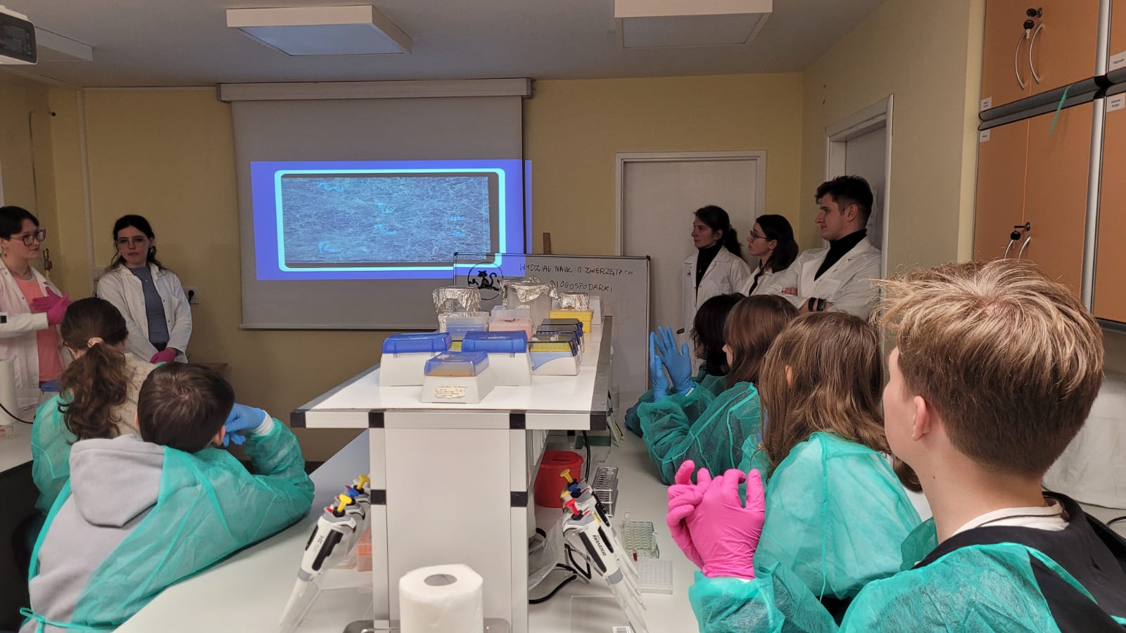 Zajęcia laboratoryjne zostały przeprowadzone przez Annę Pędziwiatr (biologia 3 rok), Blankę Jóźków (bioinżynieria 2 rok), Lidię Gozdecką (bioinformatyka w biogospodarce 2 rok), Łukasza Szargę (biotechnologia 4 rok) oraz Julię Oracz (pielęgnacja zwierząt i animaloterapię 2 rok). W warsztatach asystowali im członkowie koła: Malwina Machnio i Filip Gaca (kryminalistyka w biogospodarce 2 rok), Jagoda Radoń i Zuzanna Pawlikowska (behawiorystyka zwierząt 4 rok) oraz Izabela Sulowska (biotechnologia 3 rok).