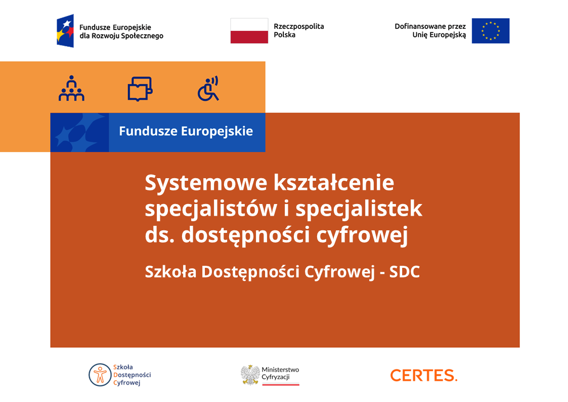 Projekt Szkoła Dostępności Cyfrowej realizowany jest przy wsparciu Funduszy Europejskich dla Rozwoju Społecznego (FERS), we współpracy z Ministerstwem Cyfryzacji, w ramach programu Fundusze Europejskie dla Rozwoju Społecznego 2021–2027. Uczestnicy projektu mają możliwość bezpłatnego zdobycia specjalistycznej wiedzy oraz praktycznych umiejętności, a także uzyskania cenionych na rynku kwalifikacji zawodowych. Program koncentruje się na praktycznym wykorzystaniu międzynarodowych standardów WCAG, przygotowując uczestników do prowadzenia audytów dostępności stron internetowych, aplikacji mobilnych i dokumentów cyfrowych oraz do projektowania i realizacji badań dostępności.