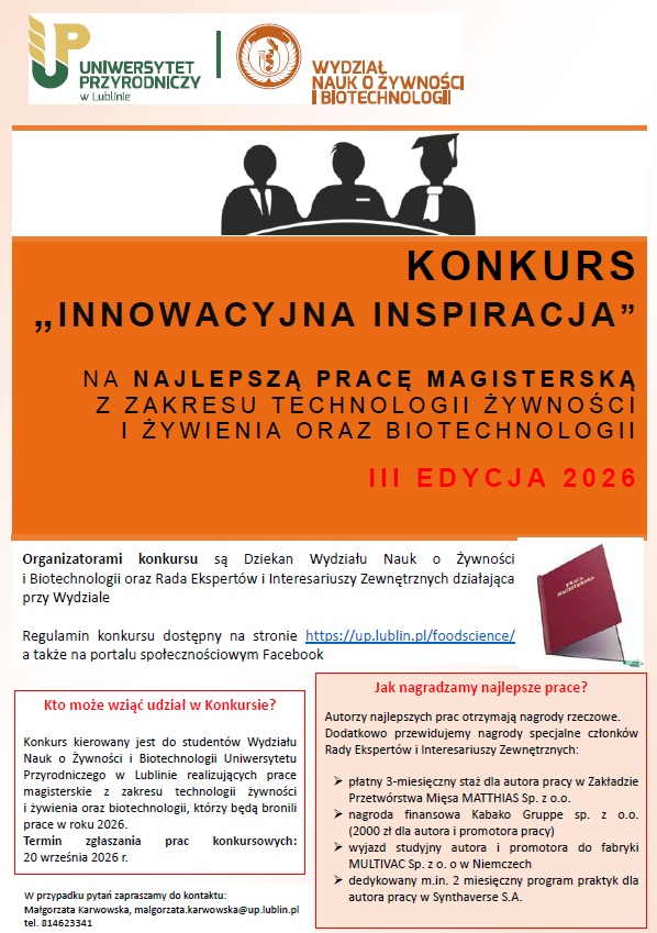 Adresaci Konkursu: studenci Wydziału Nauk o Żywności i Biotechnologii Uniwersytetu Przyrodniczego w Lublinie realizujący prace magisterskie z zakresu technologii żywności i żywienia oraz biotechnologii.