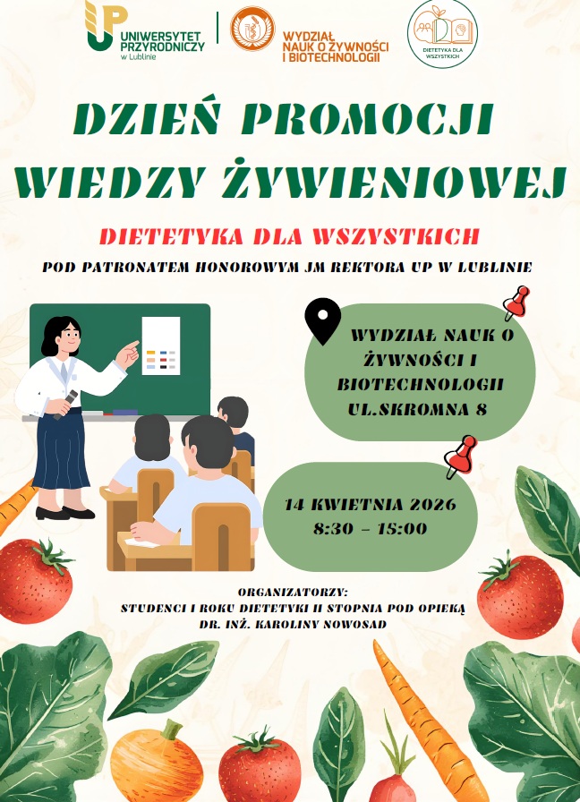Już 14 kwietnia 2026 r. w godzinach 8:30–15:00 na Wydziale Nauk o Żywności i Biotechnologii odbędzie się wydarzenie „Dietetyka dla wszystkich”, organizowane przez studentów I roku Dietetyki II stopnia pod opieką dr inż. Karoliny Nowosad, pod Honorowym Patronatem Rektora Uniwersytetu Przyrodniczego w Lublinie.