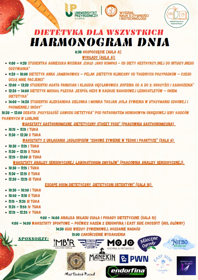 Dzień Promocji Wiedzy Żywieniowej „Dietetyka dla wszystkich” to coroczne wydarzenie przygotowywane przez studentów Dietetyki II stopnia. Akcja skierowana jest do studentów Uniwersytetu Przyrodniczego w Lublinie oraz pracowników uczelni i ma na celu popularyzację wiedzy z zakresu dietetyki w ciekawy, przystępny i inspirujący sposób.