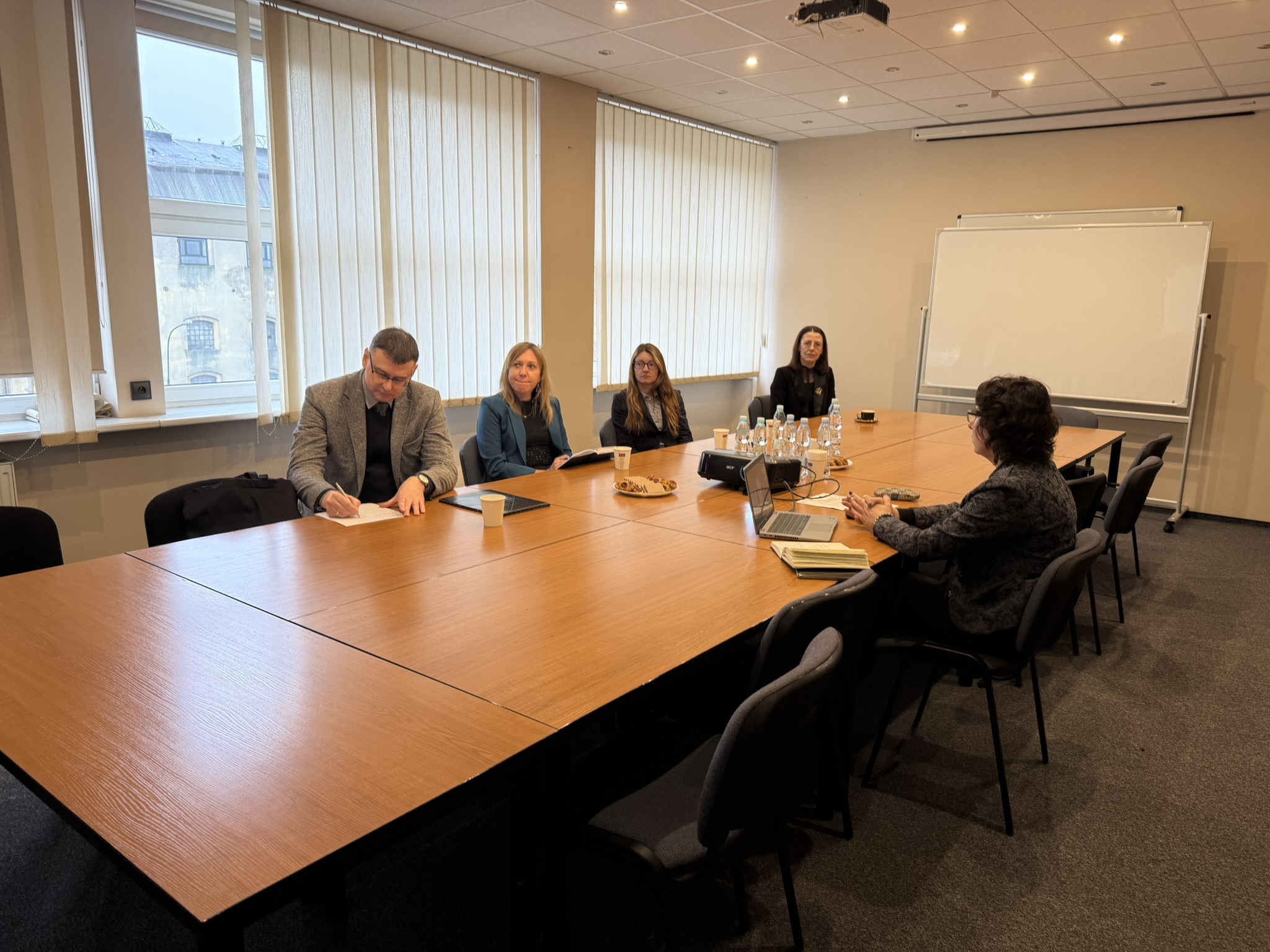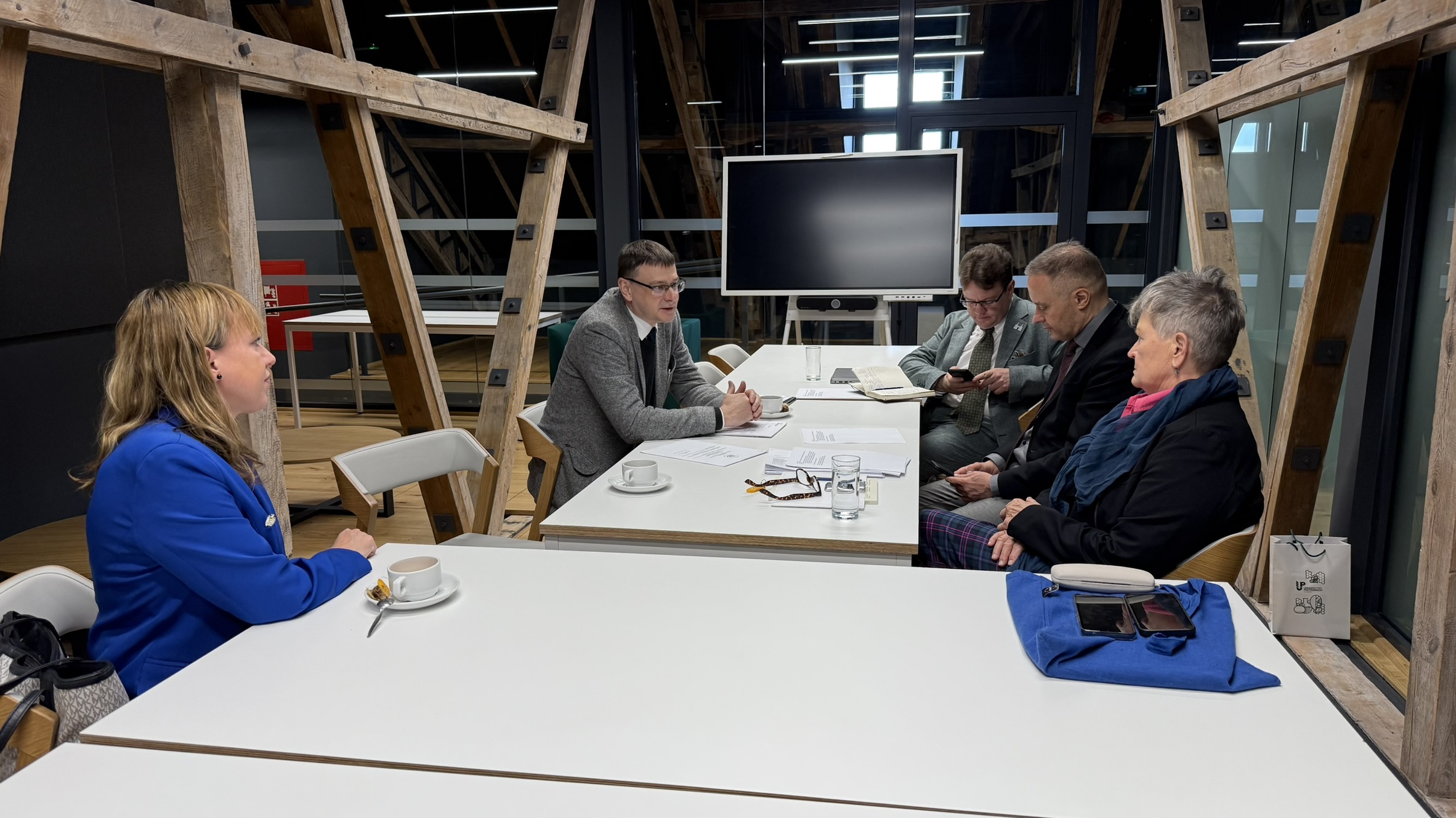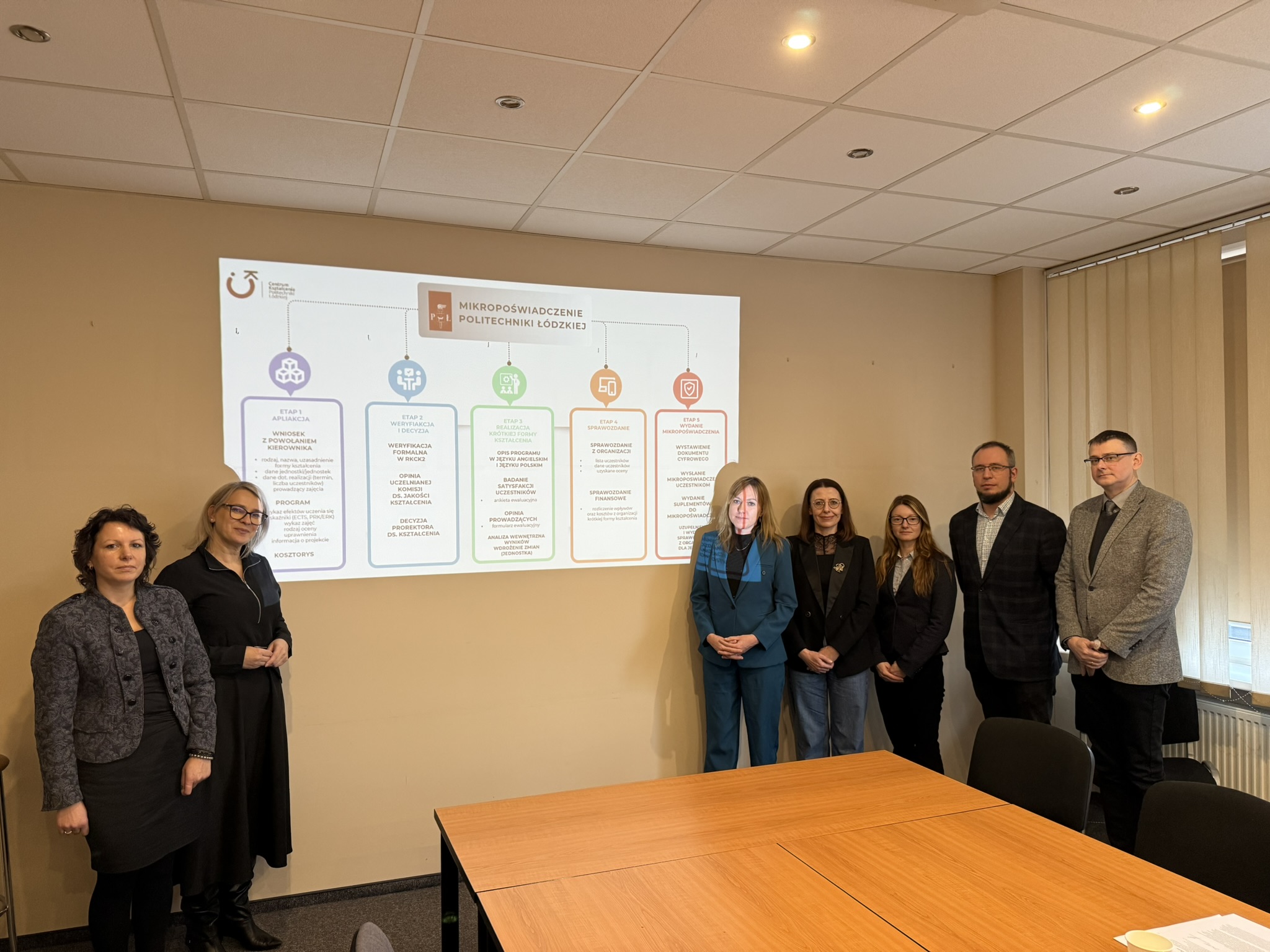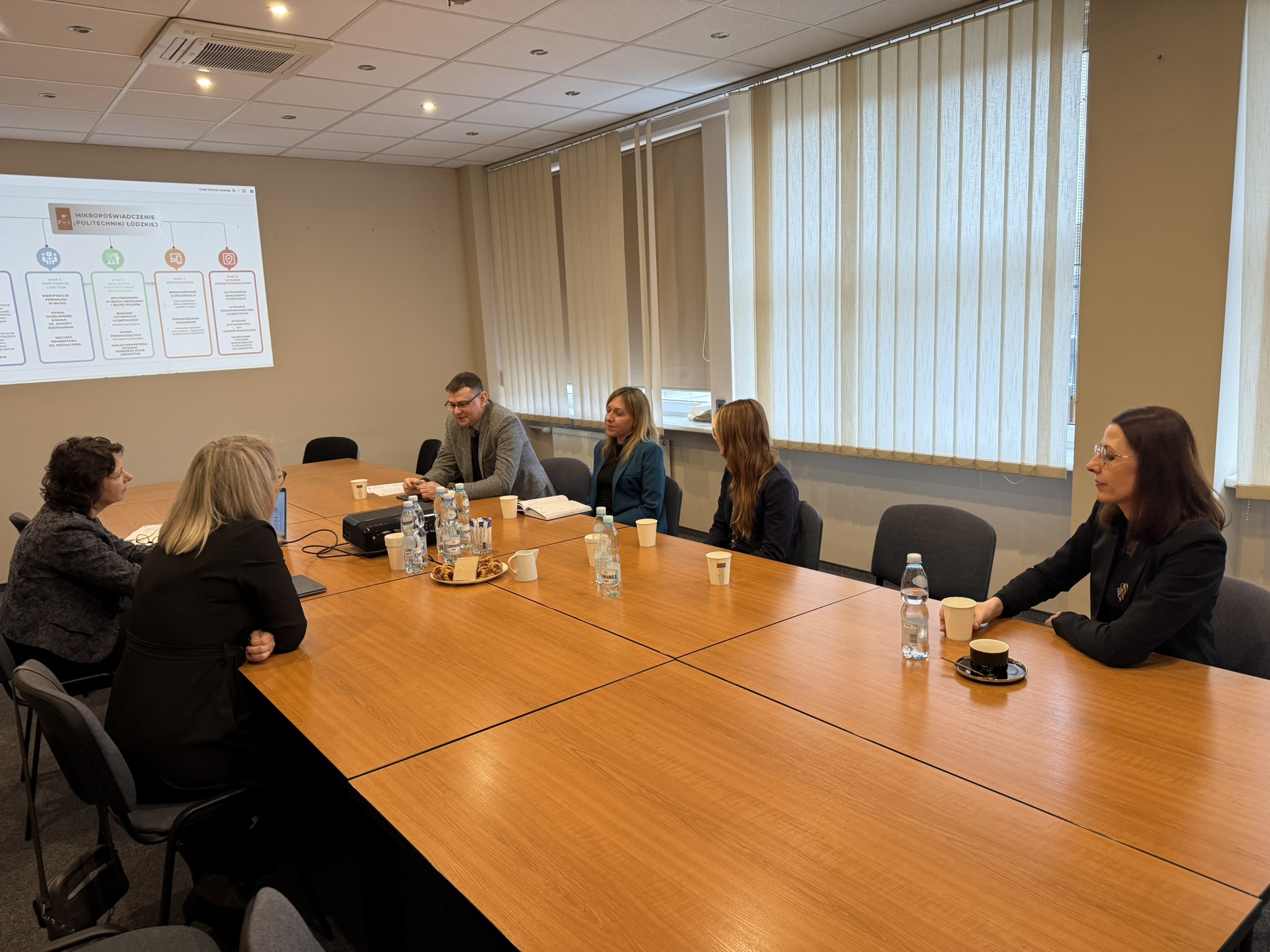 dr hab. Artur Kraszkiewicz, dr inż. Jacek Ogrodniczek, dr hab. Beata Biernacka, dr inż. Małgorzata Góral-Kowalczyk i mgr Marta Czyżykiewicz, wzięli udział w spotkaniu z przedstawicielami Politechniki Łódzkiej: Panią mgr Adrianną Kozłowską – Dyrektor Centrum Kształcenia Politechniki Łódzkiej i Panią dr inż. Joanną Szmyt – specjalistką z ramienia Centrum Kształcenia Politechniki Łódzkiej w zakresie budowania i promowania oferty mikropoświadczeń.